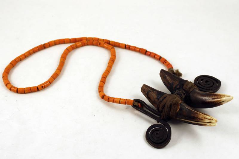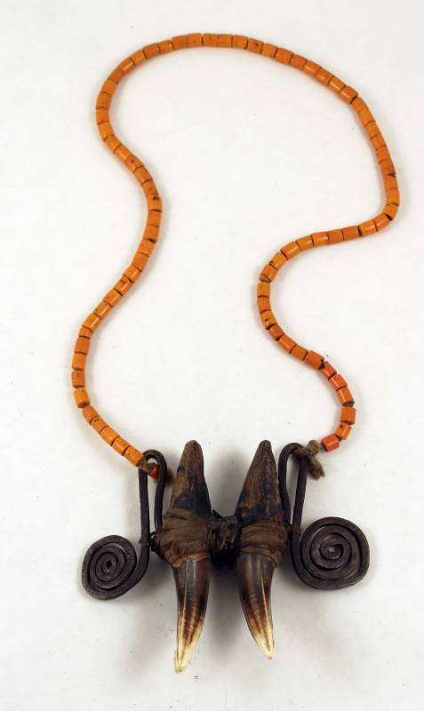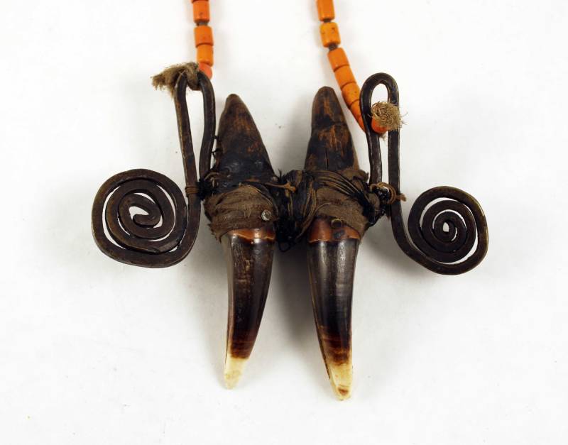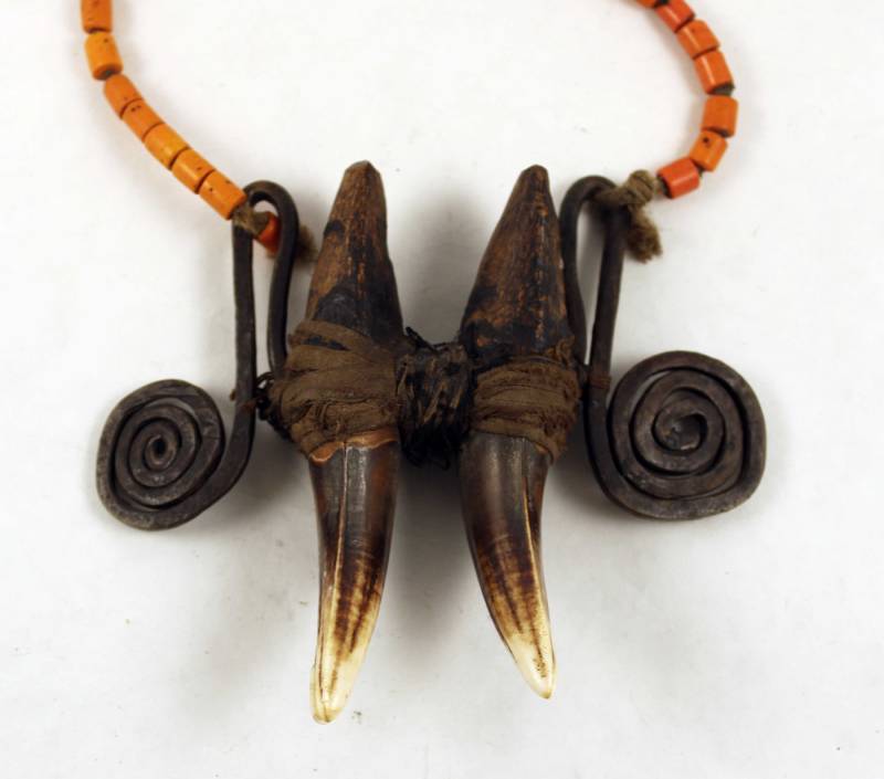 Materials: tiger teeth, bronze, glass beads and natural fibers.
