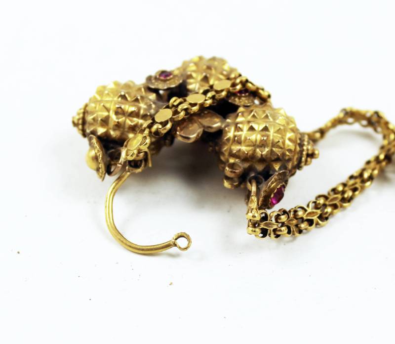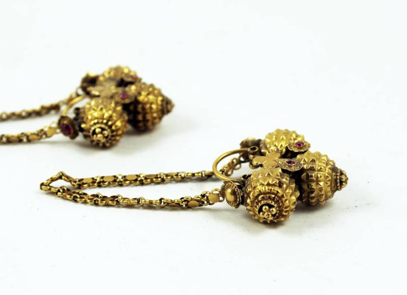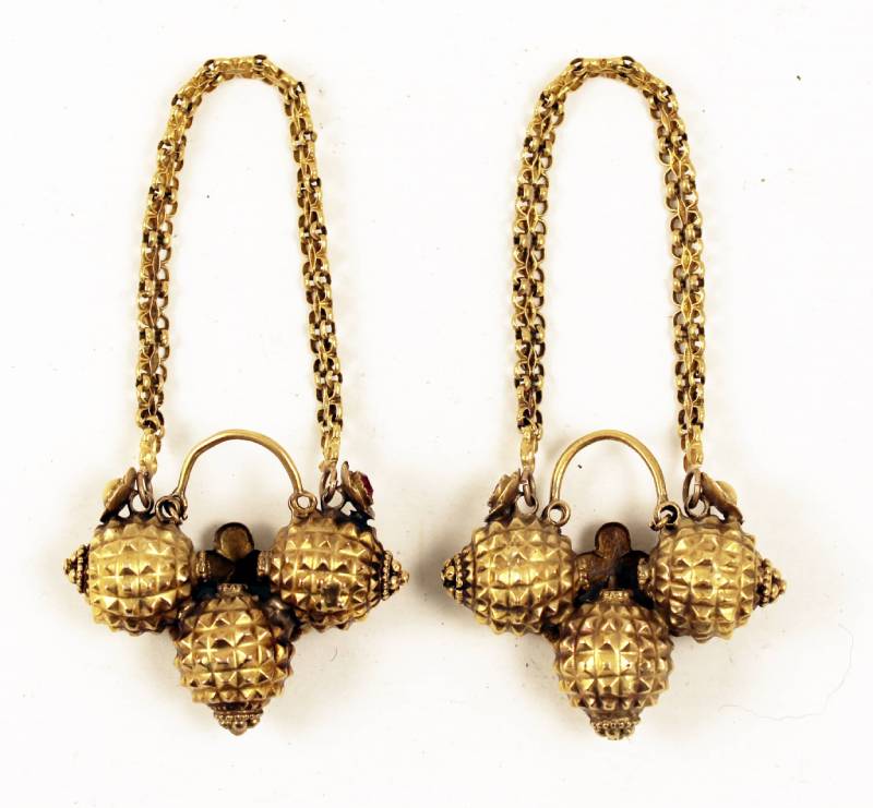 Gold earrings from Himachal Pradesh, India. They have a support chain to avoid excessive weight on the earlobe. The three-ball decoration imitates the blossoms of the Babul tree (Acacia Arabica) which is believed to be a favorite spirit haunt.