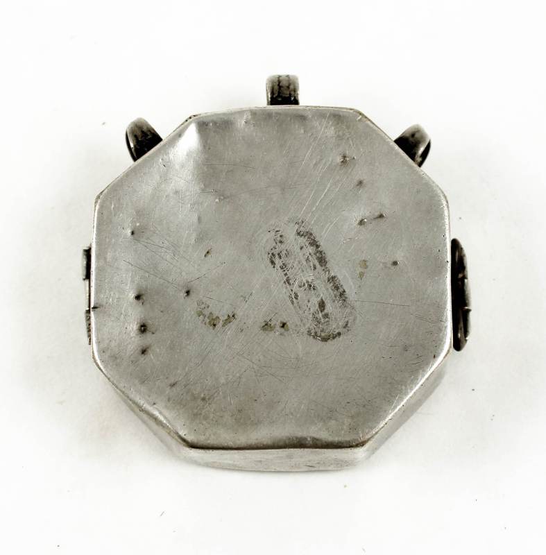 This is a rare silver box. Although it looks Persian at first sight, when examined closely it seems to be from a different region. It is still Quoran box amulet , with a lid that opens, but the decoration looks maybe Middle Eastern. It also has three bails, which suggests that it is worn, not on the forearm (as Persian/Afghans ones) but probably hanging as a pendant.